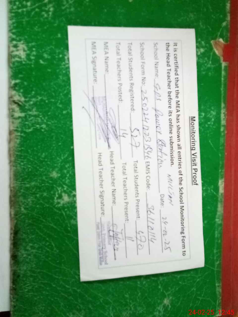 | Attendance Register | Head Teacher | MEA with School | Visit Proof |