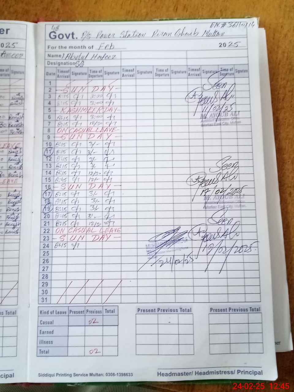 | CNIC | Full Name | Designation | R/C | Absence During Last Calender Month |