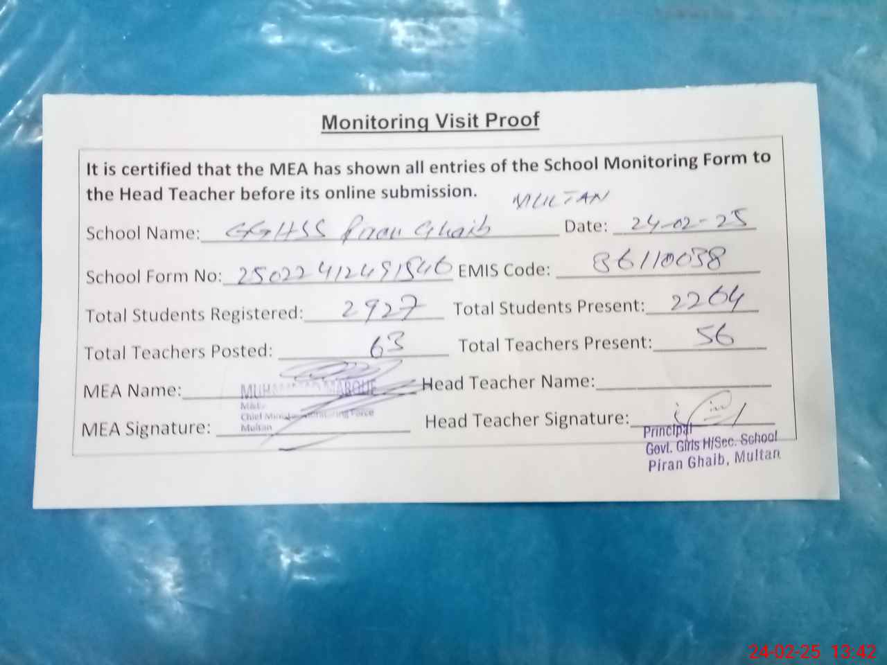 | Attendance Register | Head Teacher | MEA with School | Visit Proof |