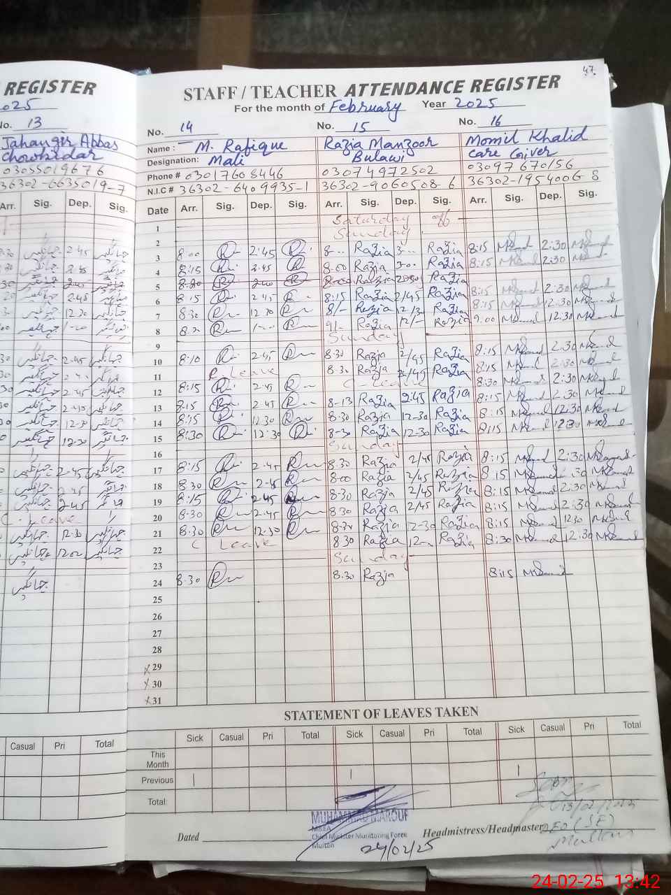| CNIC | Full Name | Designation | R/C | Absence During Last Calender Month |