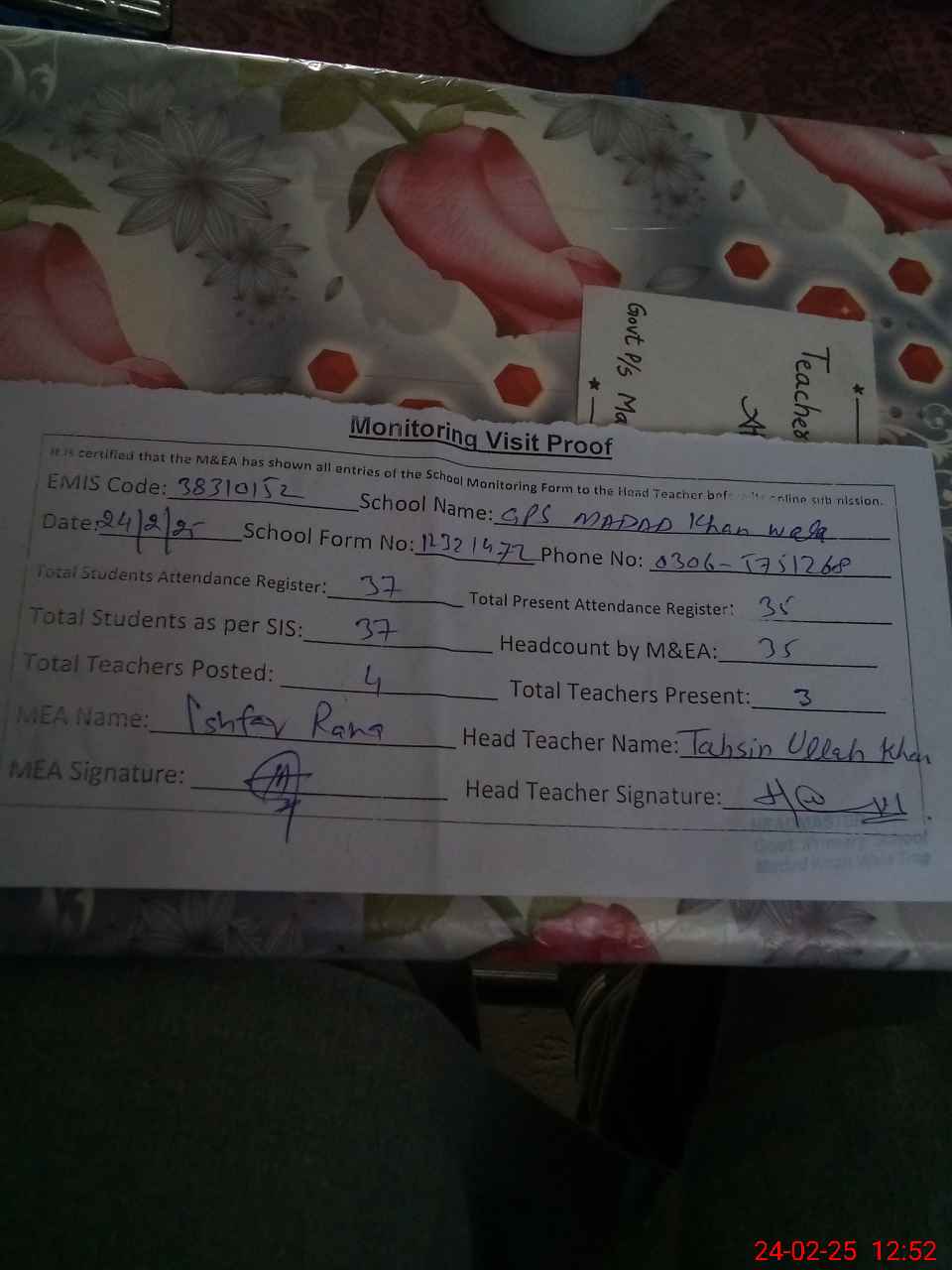 | EMIS Code: 38310152 | Name of School: GPS MADAD KHAN WALA PO TRAG ISA KHEL MIANWALI | |||