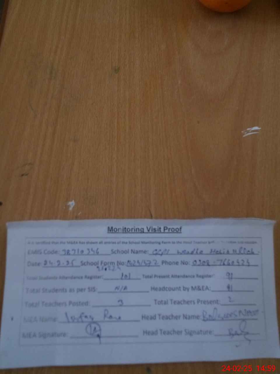 | Attendance Register | Head Teacher | MEA with School | Visit Proof |
