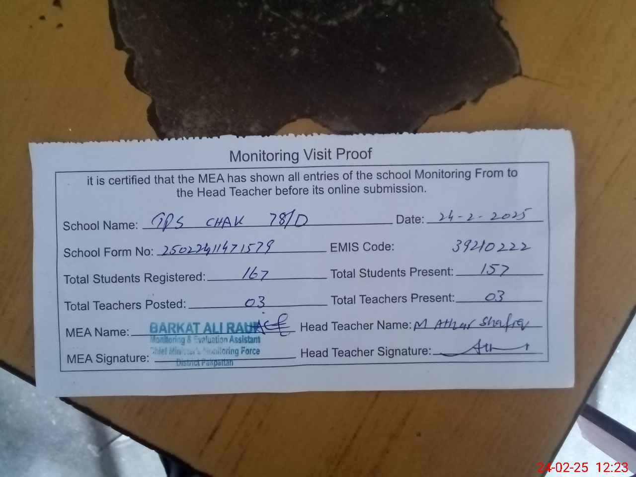 | Attendance Register | Head Teacher | MEA with School | Visit Proof |