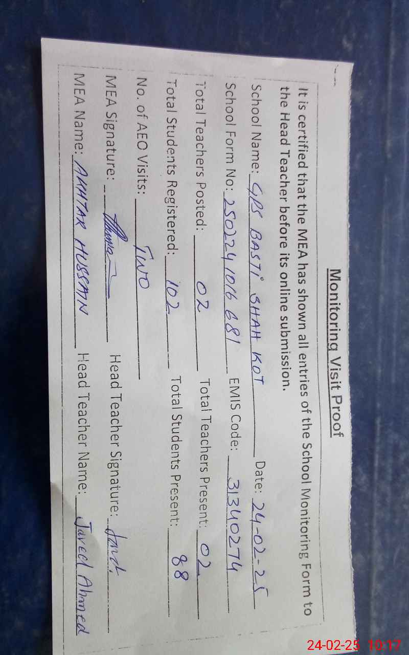 | EMIS Code: 31340274 | Name of School: GPS BASTI SHAH KOT | |||