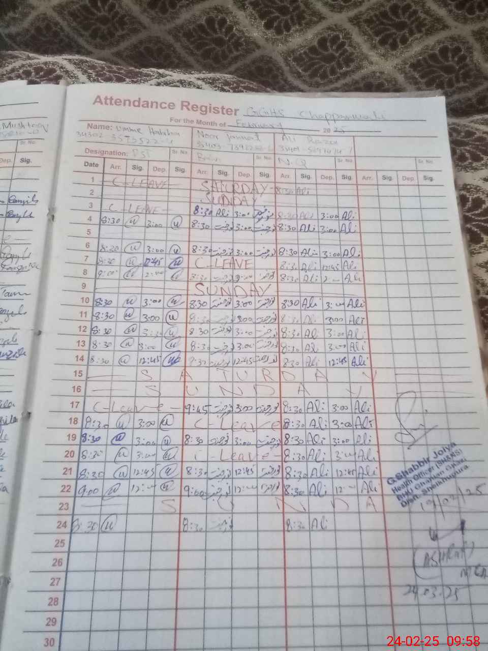 | CNIC | Full Name | Designation | R/C | Absence During Last Calender Month |
