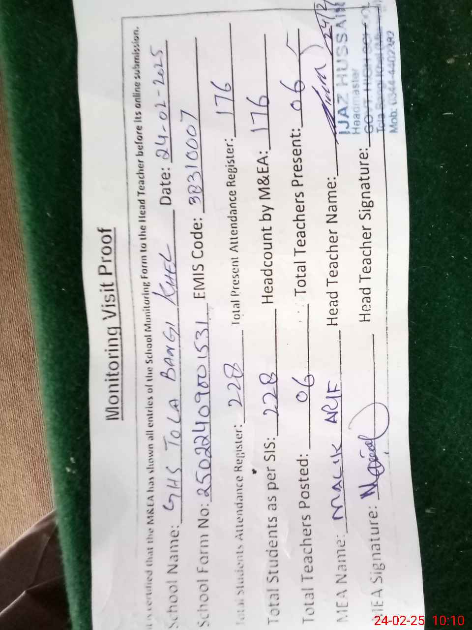 | Attendance Register | Head Teacher | MEA with School | Visit Proof |