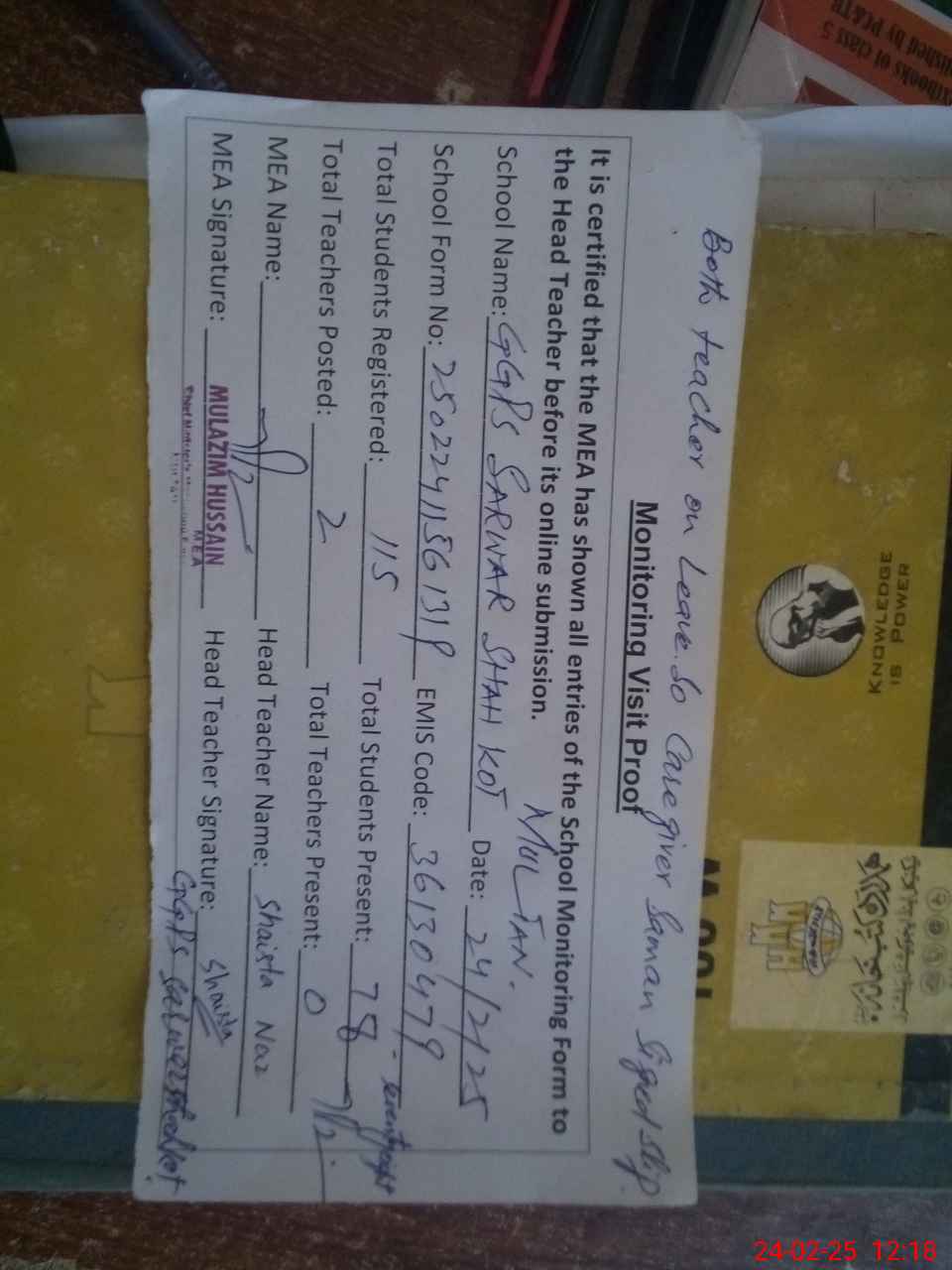 | Attendance Register | Head Teacher | MEA with School | Visit Proof |