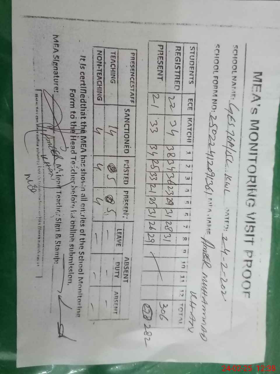 | Attendance Register | Head Teacher | MEA with School | Visit Proof |
