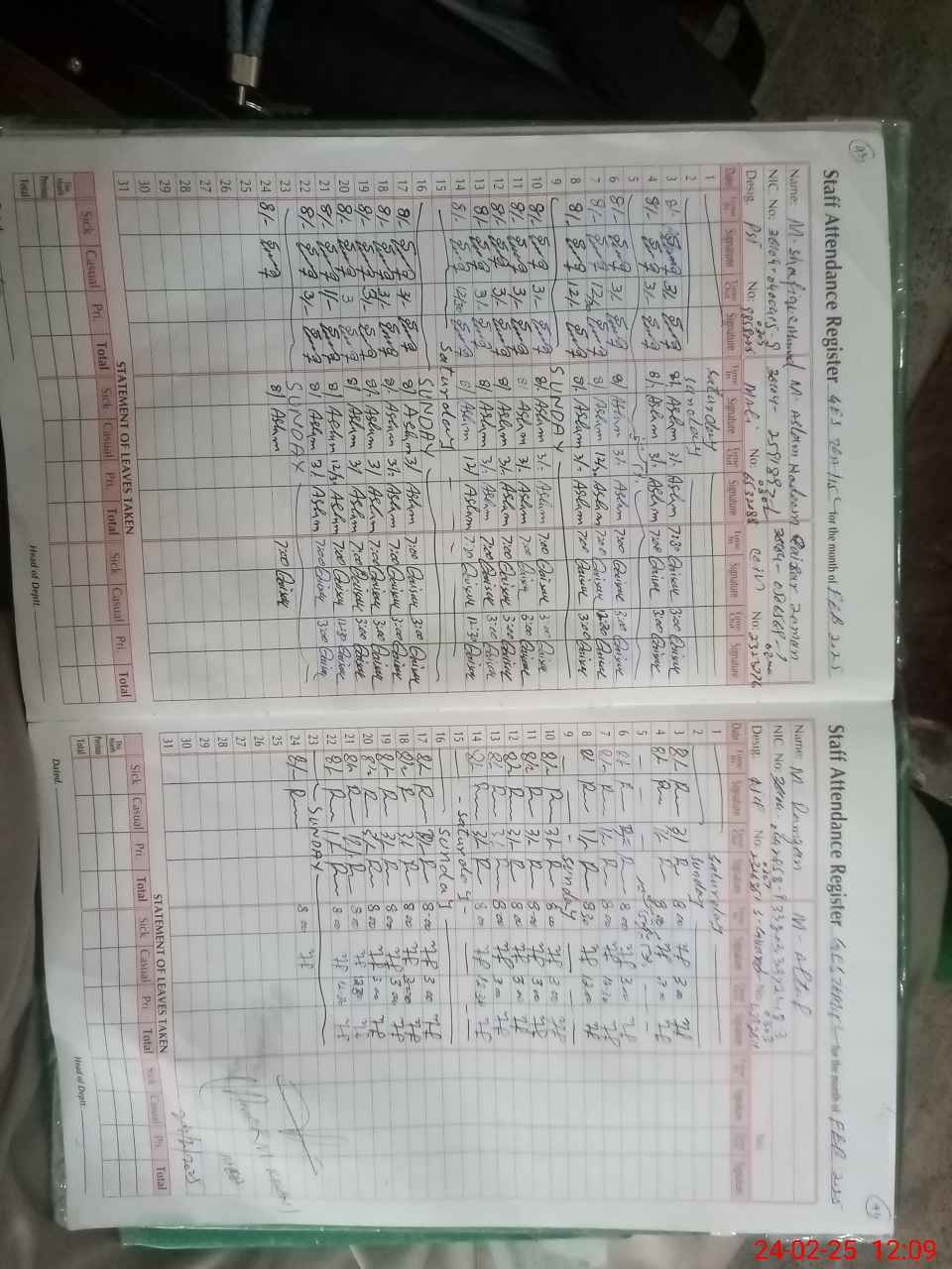| CNIC | Full Name | Designation | R/C | Absence During Last Calender Month |