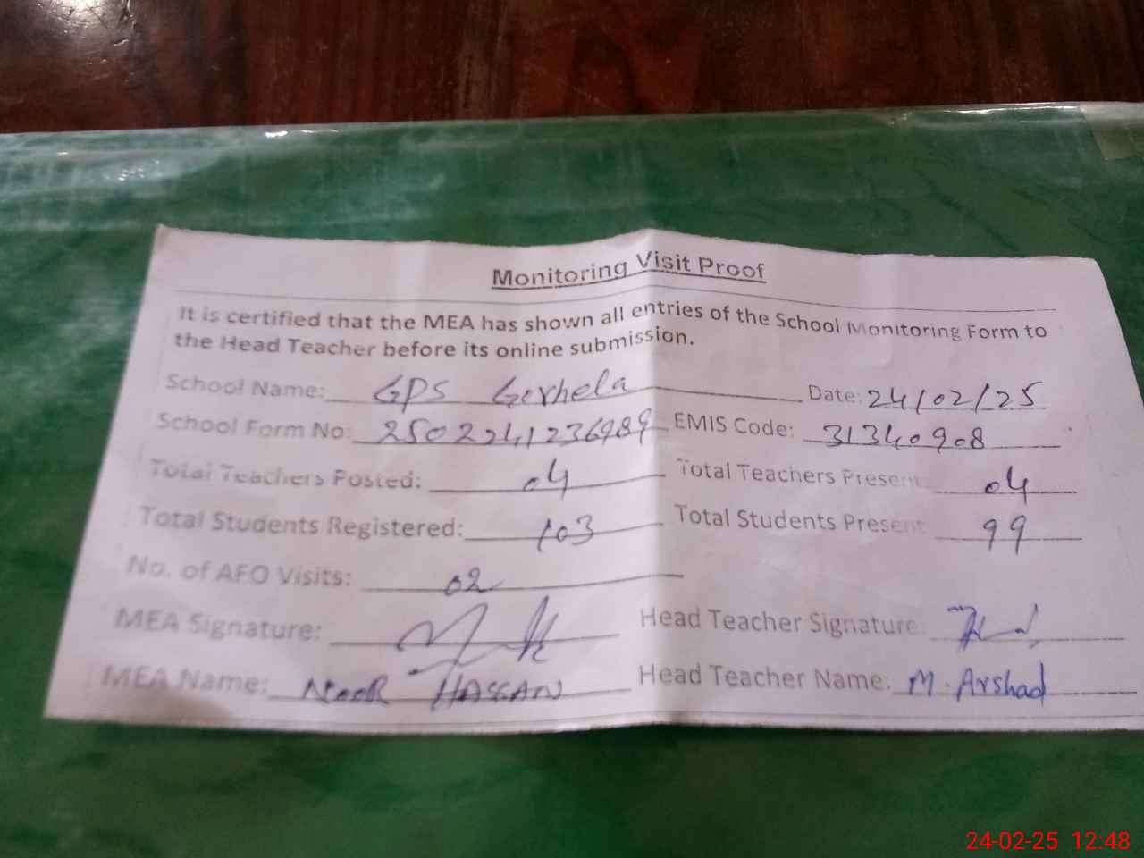 | Attendance Register | Head Teacher | MEA with School | Visit Proof |