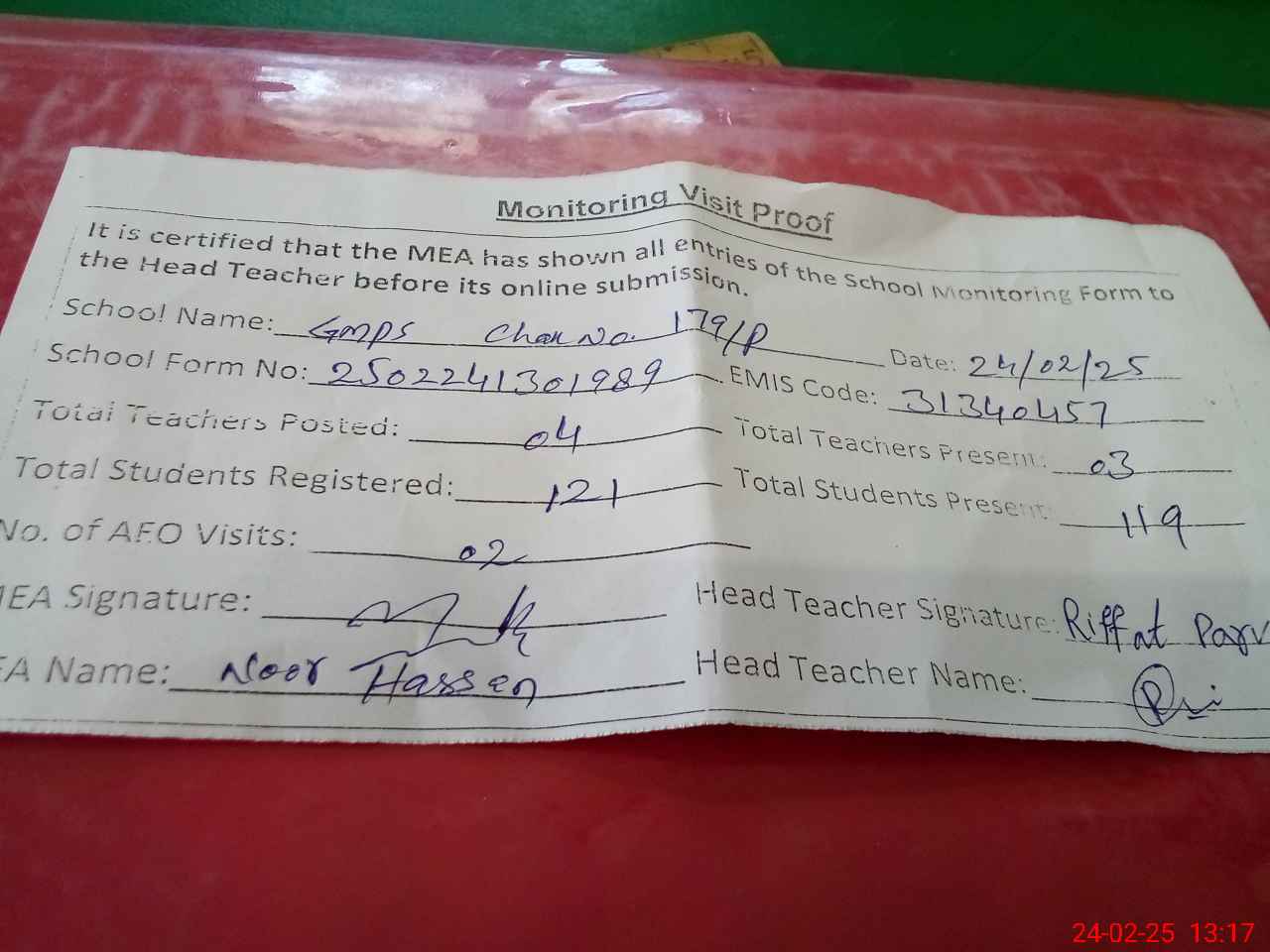 | Attendance Register | Head Teacher | MEA with School | Visit Proof |