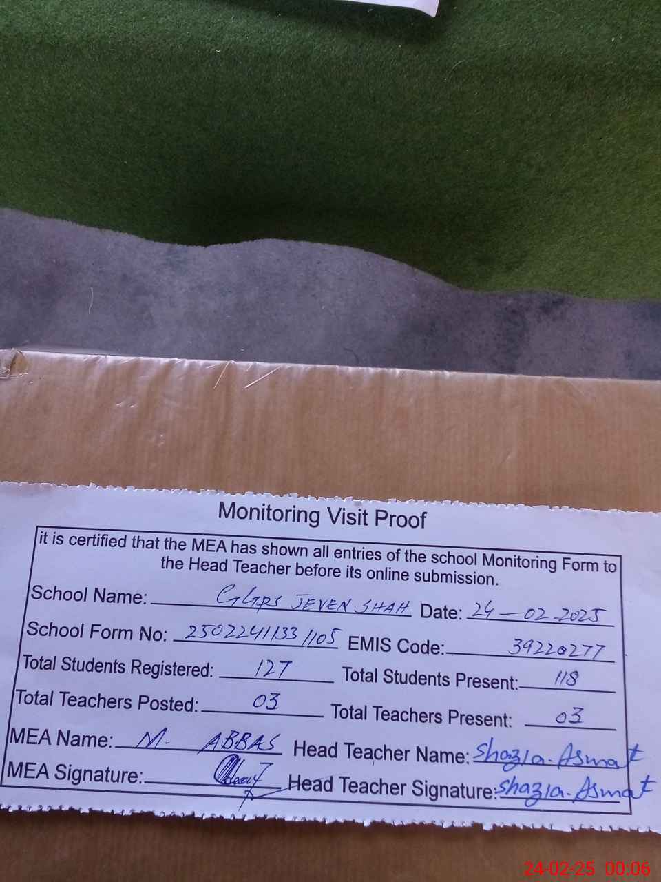 | Attendance Register | Head Teacher | MEA with School | Visit Proof |