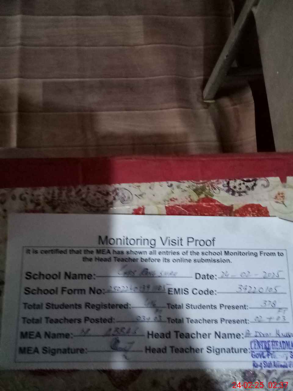 | Certified that this School was Inspected by the Undersigned MEA/DMO Today and the Information Stated Above is as Per Record. | |||||