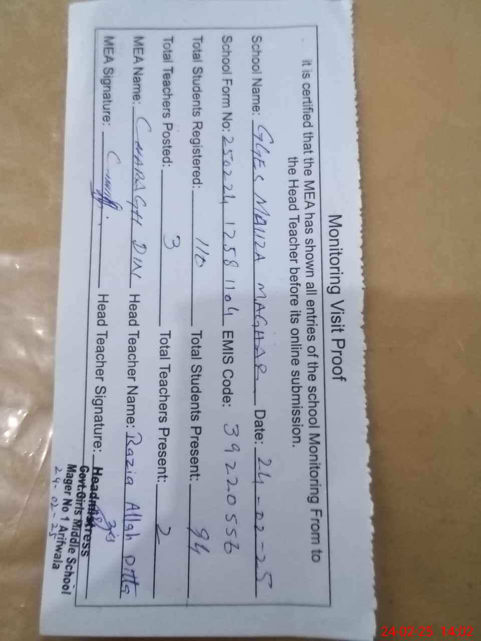 | Attendance Register | Head Teacher | MEA with School | Visit Proof |