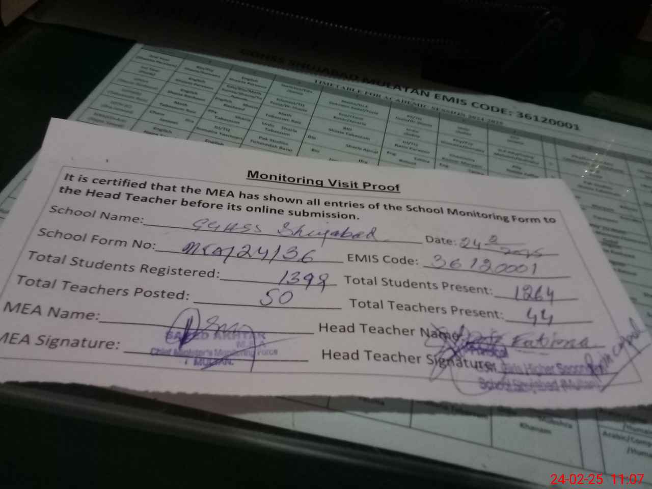 | Certified that this School was Inspected by the Undersigned MEA/DMO Today and the Information Stated Above is as Per Record. | |||||