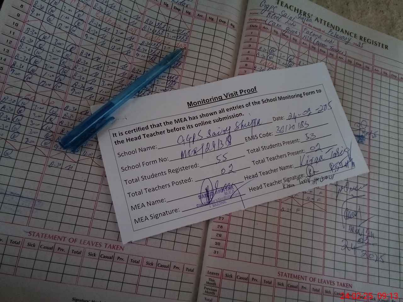 | Attendance Register | Head Teacher | MEA with School | Visit Proof |