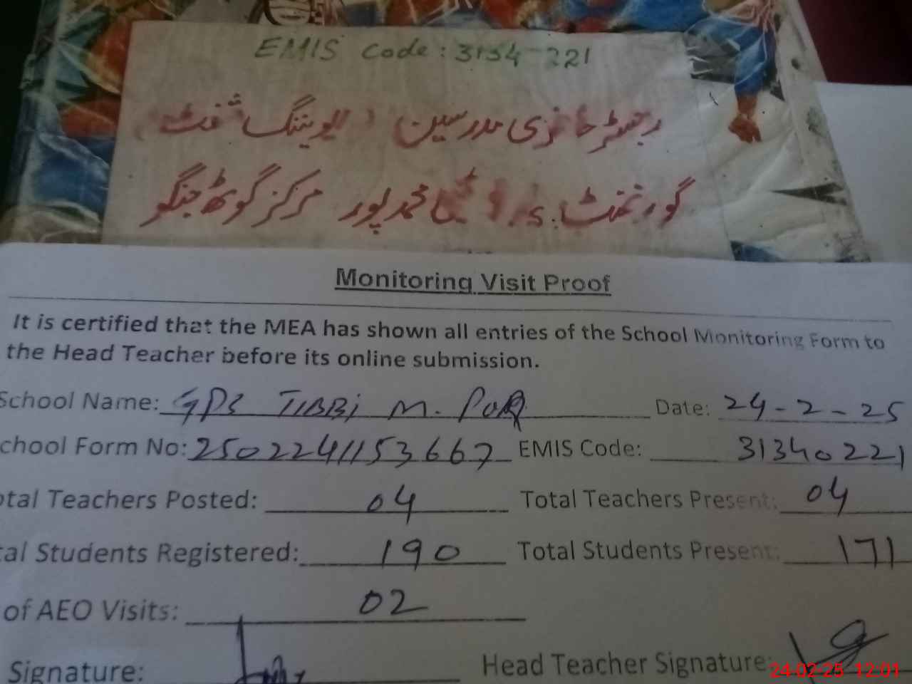 | Attendance Register | Head Teacher | MEA with School | Visit Proof |