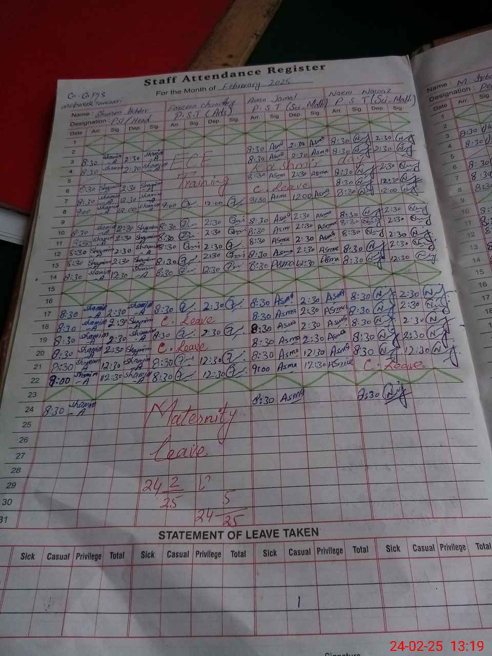 | Leave | Duty | Absent | Maternity | Medical | Ex- Pak |