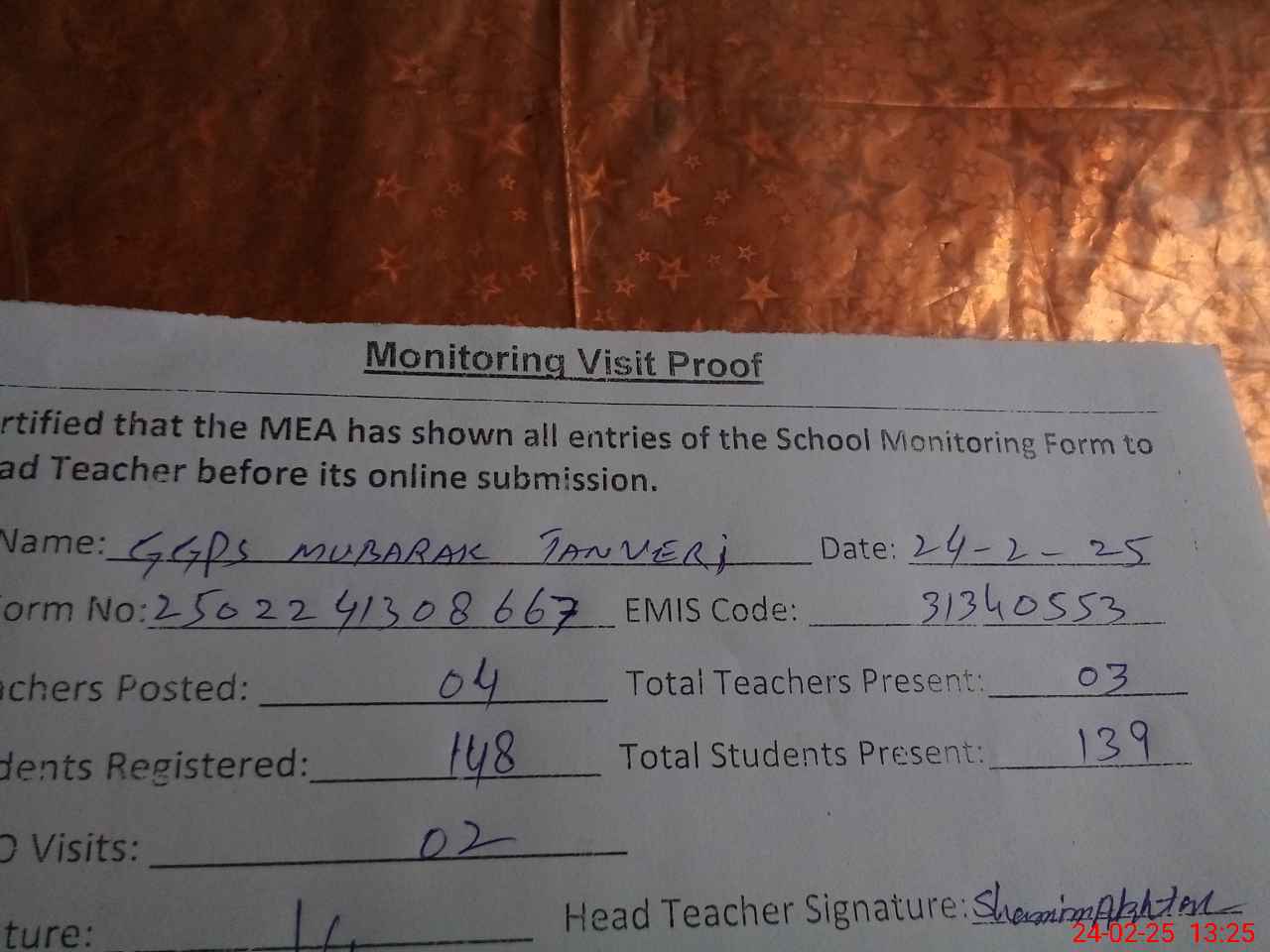 | Attendance Register | Head Teacher | MEA with School | Visit Proof |