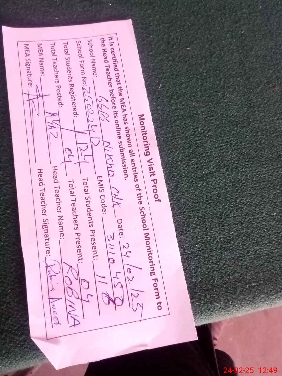 | Attendance Register | Head Teacher | MEA with School | Visit Proof |