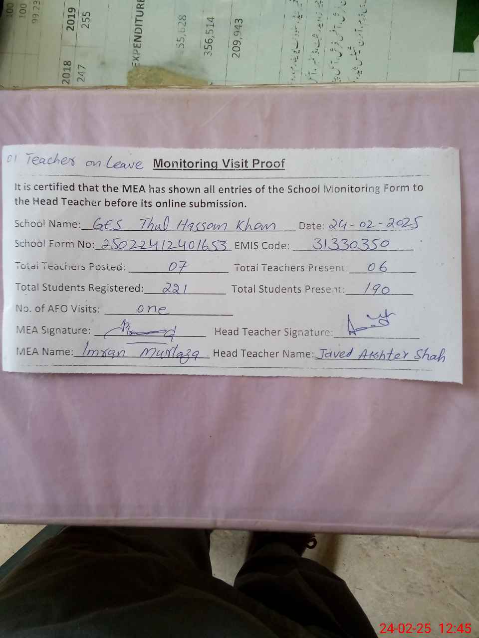 | Attendance Register | Head Teacher | MEA with School | Visit Proof |