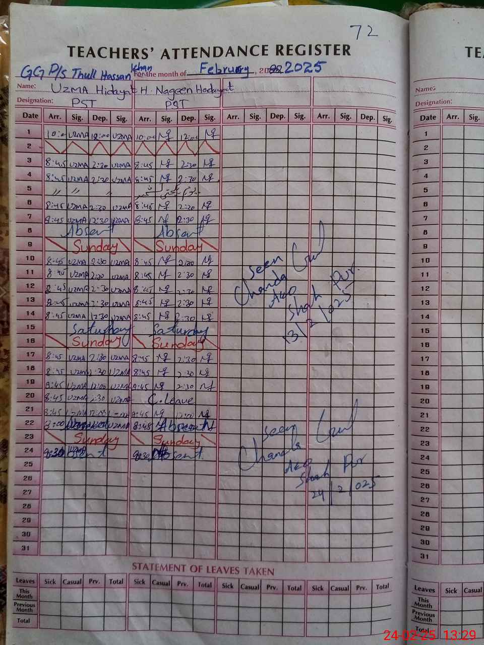 | Leave | Duty | Absent | Maternity | Medical | Ex- Pak |