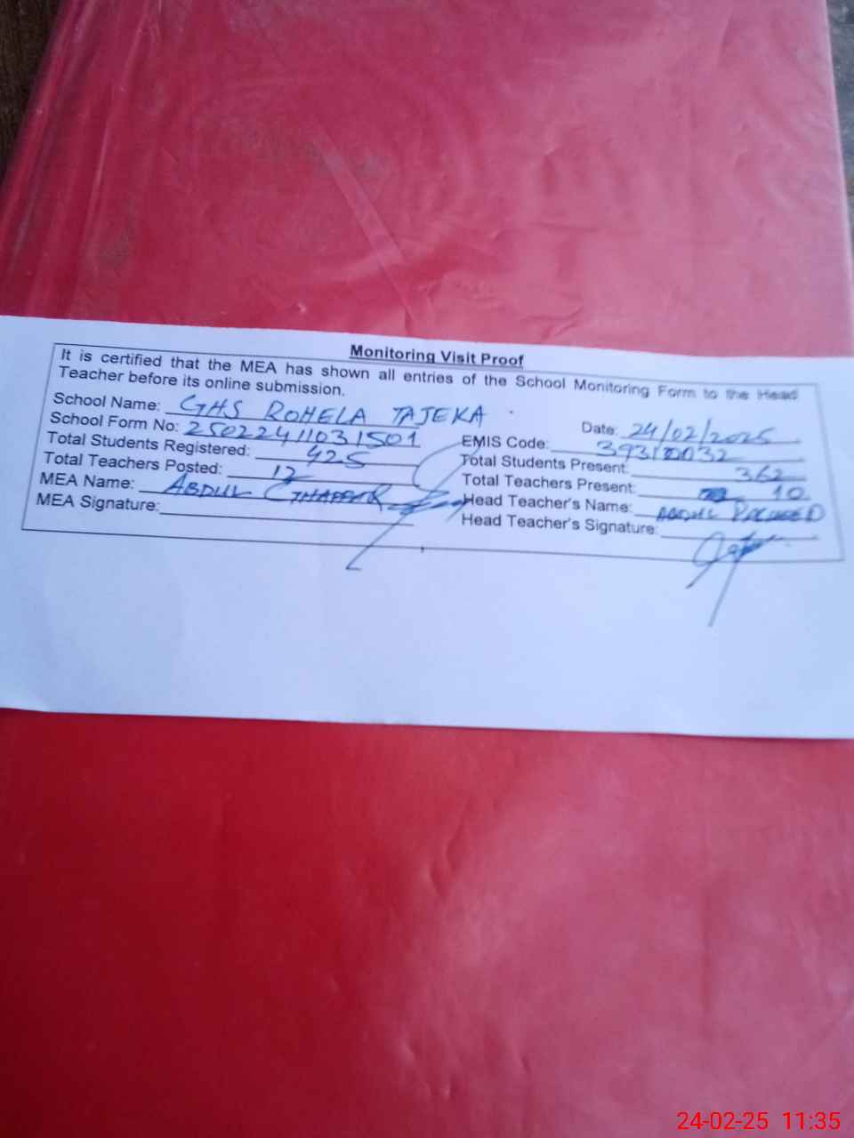 | Attendance Register | Head Teacher | MEA with School | Visit Proof |