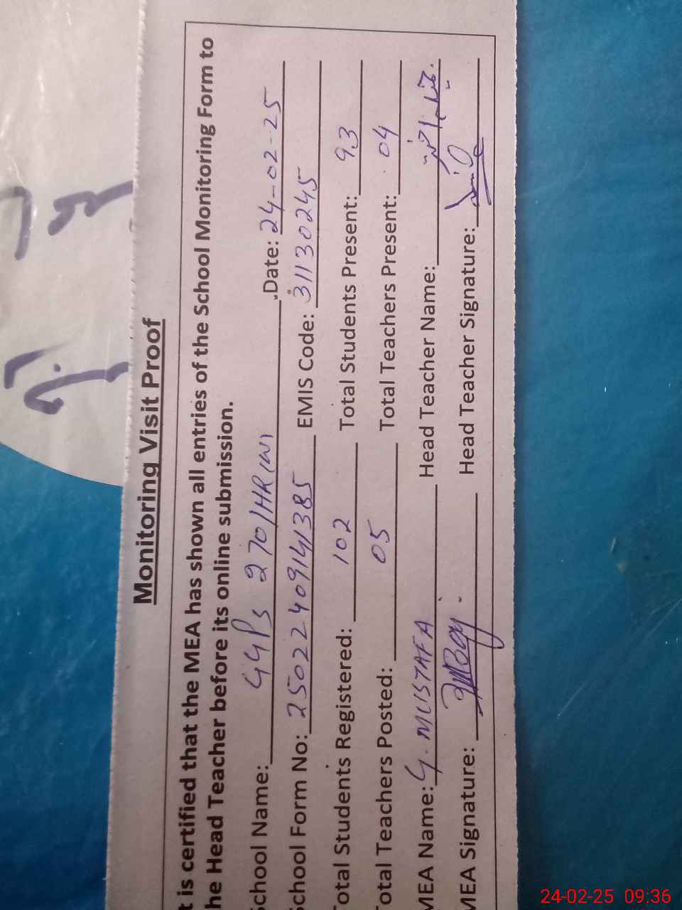 | Attendance Register | Head Teacher | MEA with School | Visit Proof |