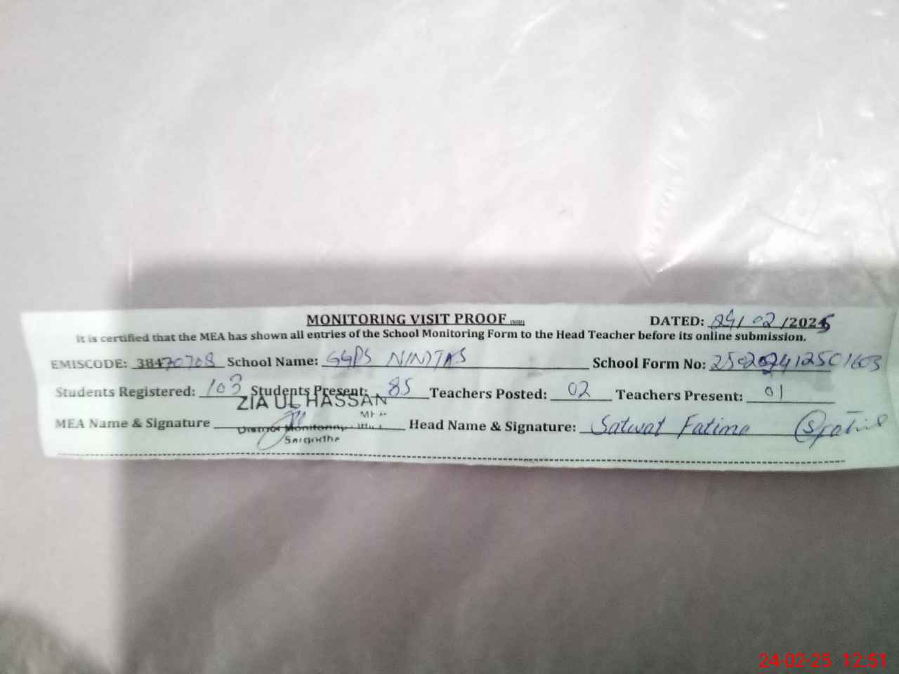 | Monitoring Date: 24-02-2025 | Start Time: 24-02-2025 12:19 PM | End Time: 24-02-2025 12:52 PM | Name of MEA: ZI**** ULHA**** | |