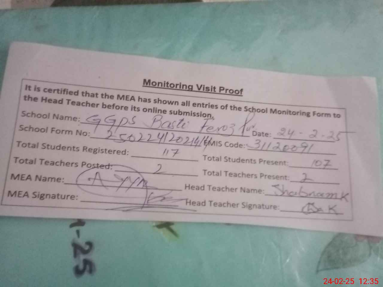 | Attendance Register | Head Teacher | MEA with School | Visit Proof |