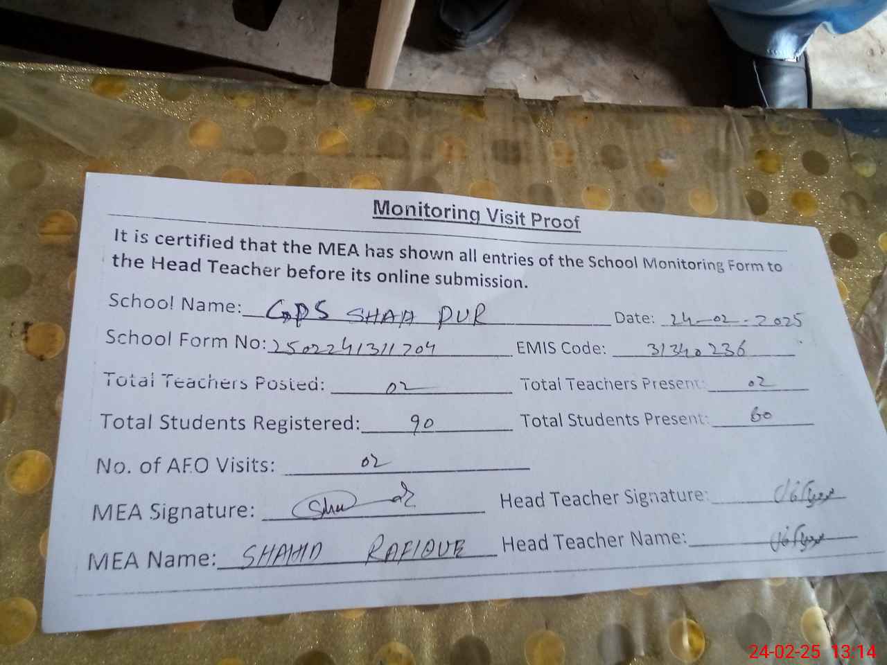 | Certified that this School was Inspected by the Undersigned MEA/DMO Today and the Information Stated Above is as Per Record. | |||||