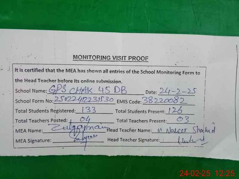 | EMIS Code: 38220082 | Name of School: GPS CHAK NO. 45/DB | |||