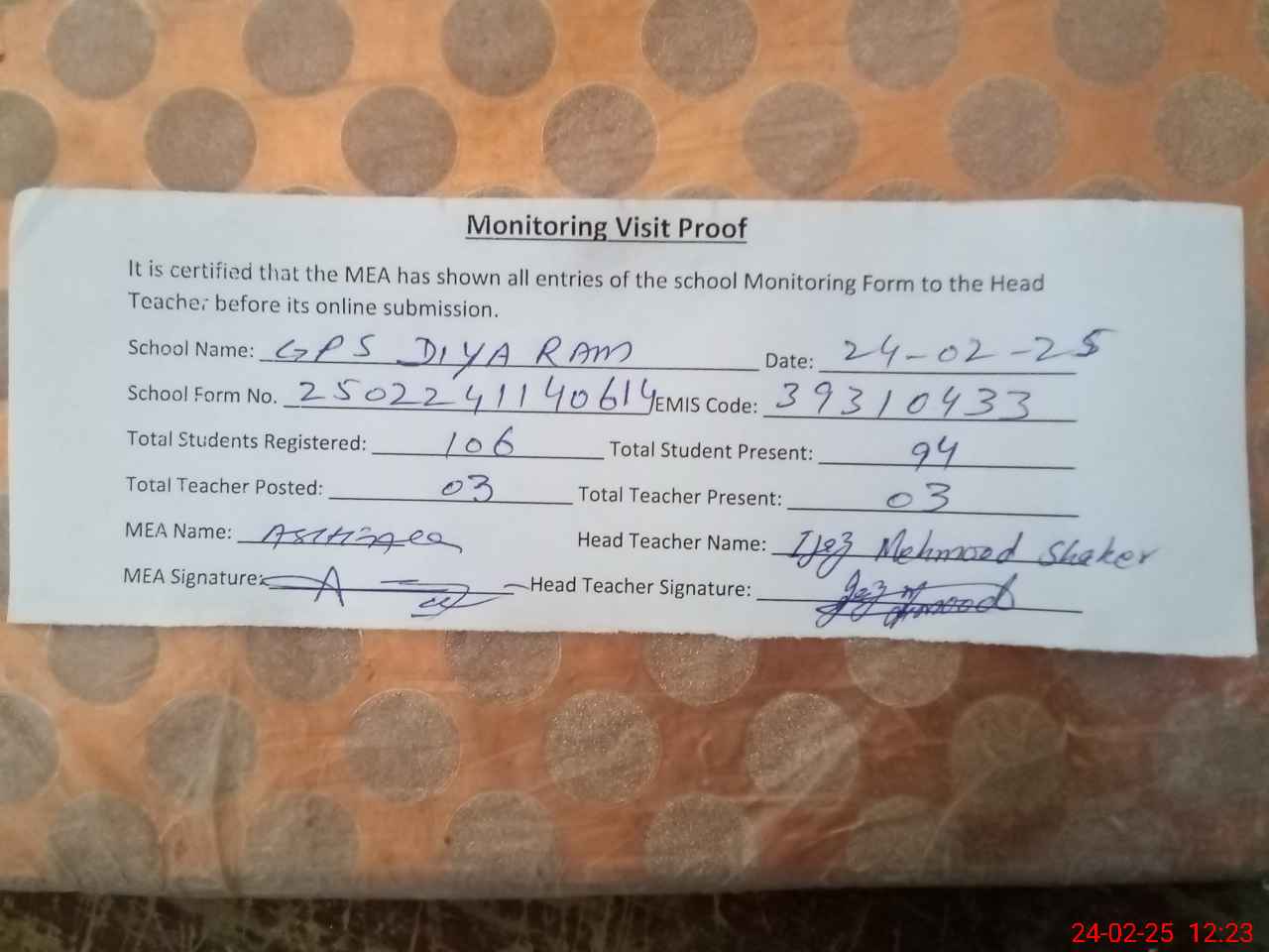 | EMIS Code: 39310433 | Name of School: GPS DIYA RAAM | |||