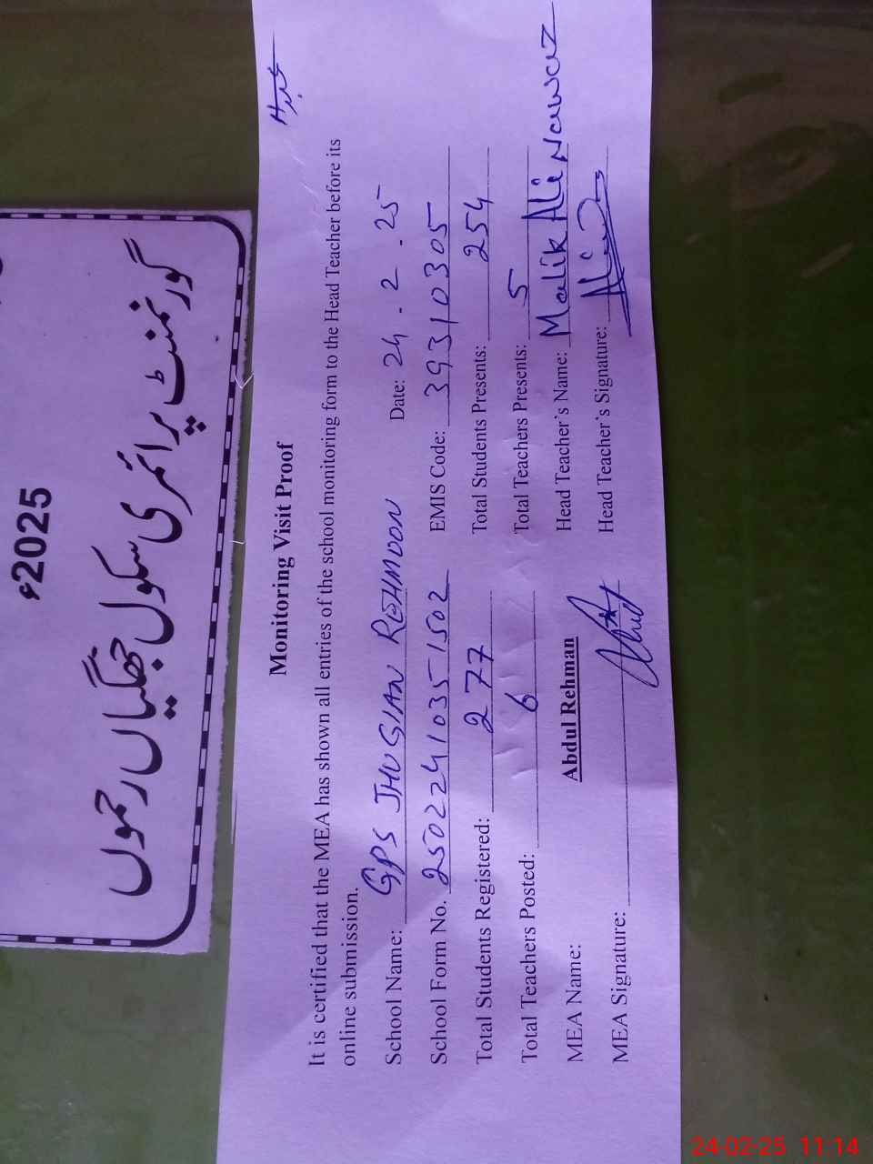 | Attendance Register | Head Teacher | MEA with School | Visit Proof |