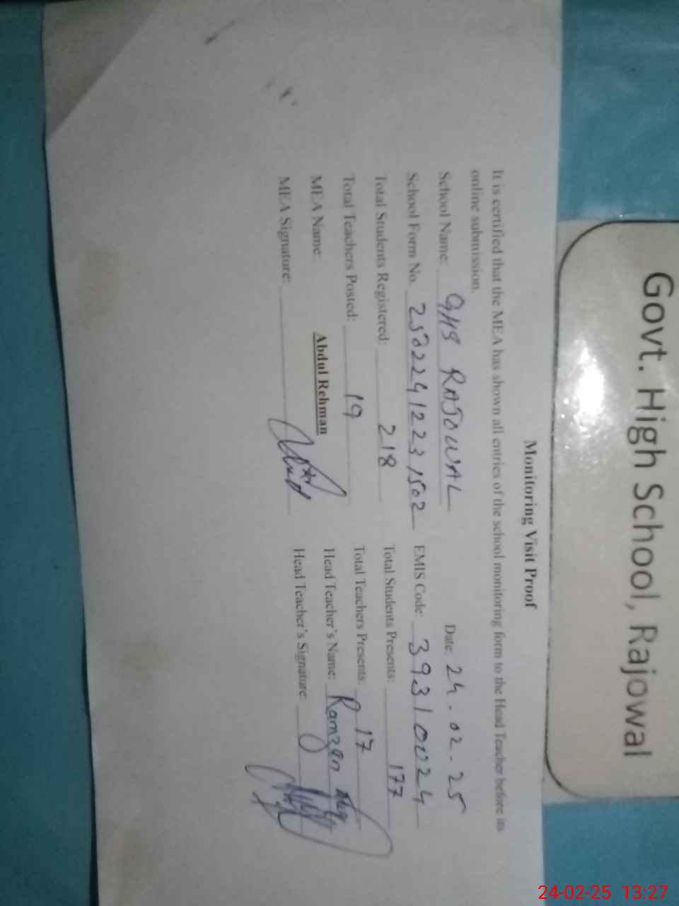 | EMIS Code: 39310024 | Name of School: GHS RAJOWAL | |||
