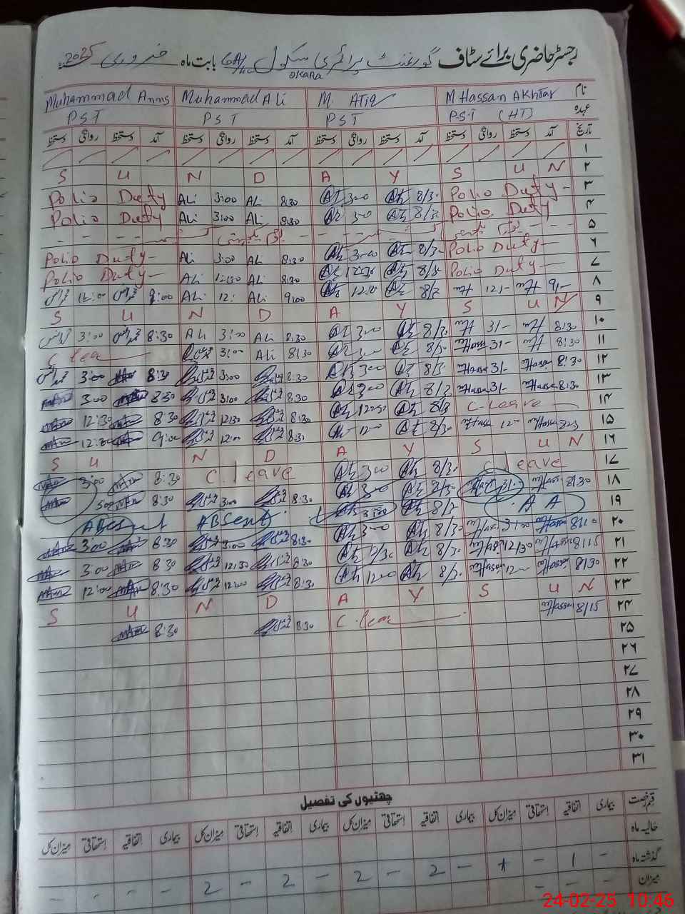 | Leave | Duty | Absent | Maternity | Medical | Ex- Pak |