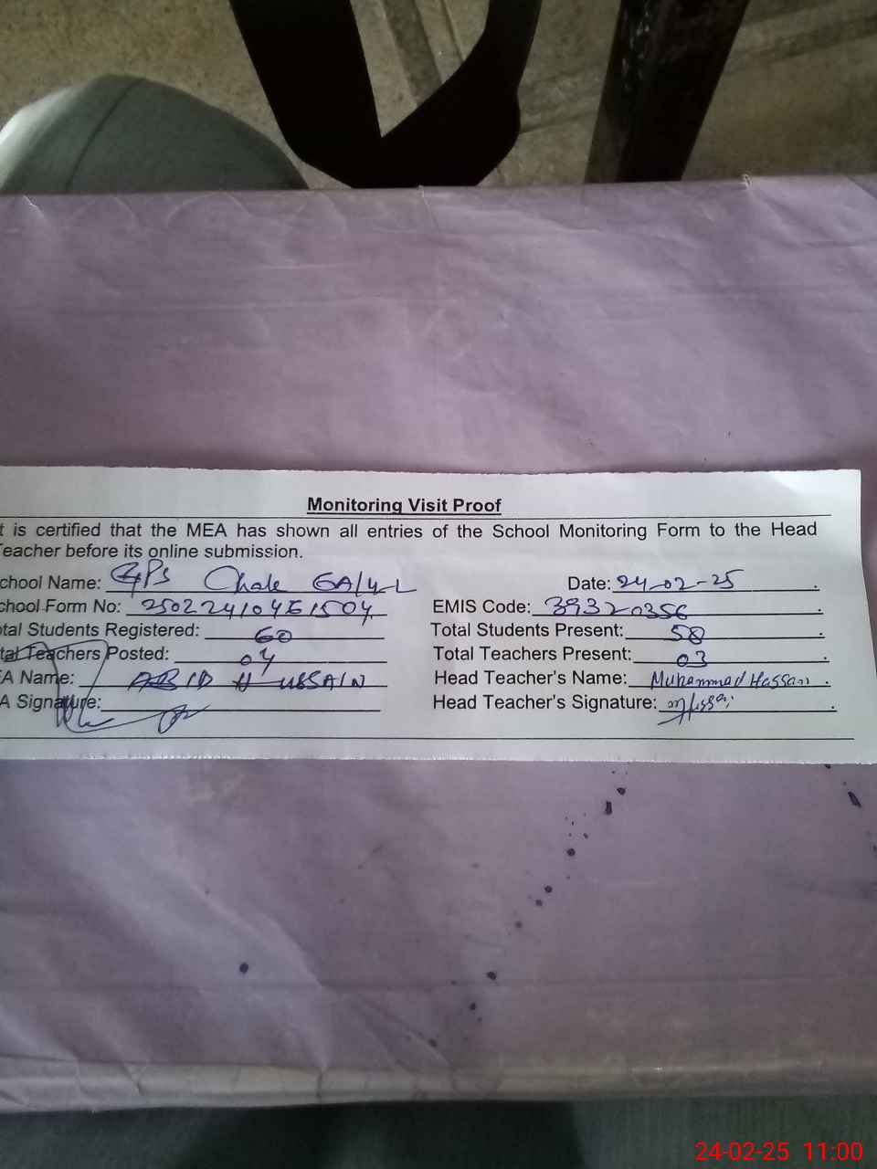 | Attendance Register | Head Teacher | MEA with School | Visit Proof |