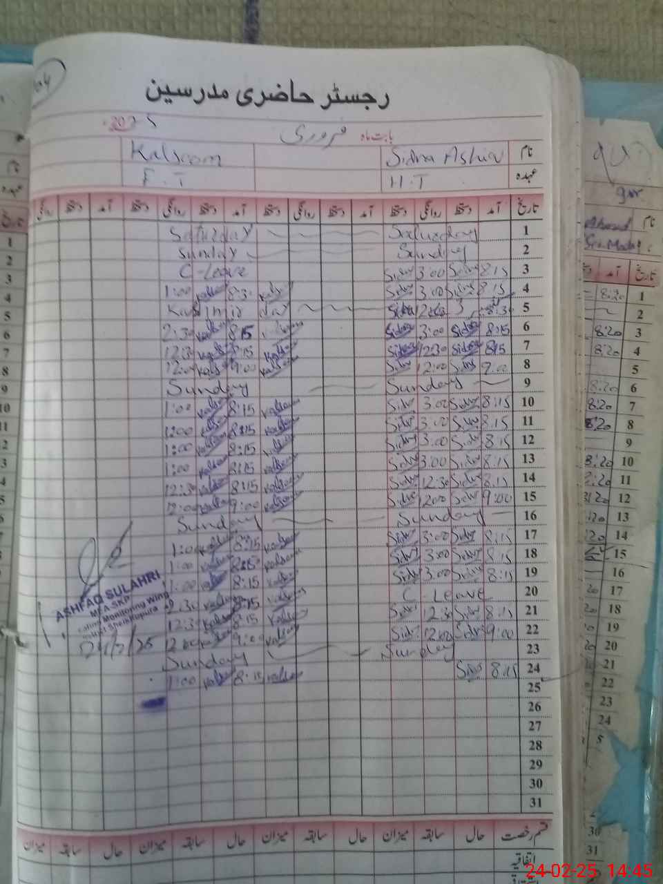 | CNIC | Full Name | Designation | R/C | Absence During Last Calender Month |