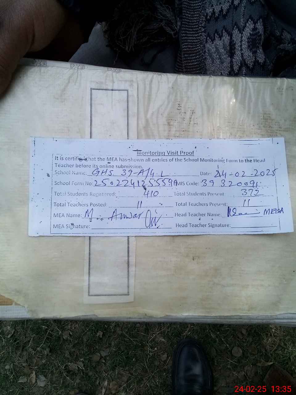 | Attendance Register | Head Teacher | MEA with School | Visit Proof |