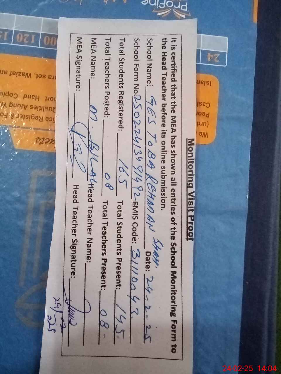 | EMIS Code: 31110043 | Name of School: GES TOBA RAHMAN SHAH | |||