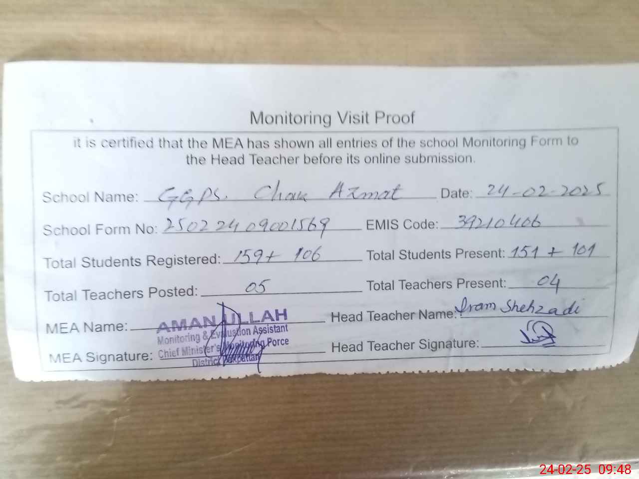 | EMIS Code: 39210406 | Name of School: GGPS CHAK AZMAT | |||