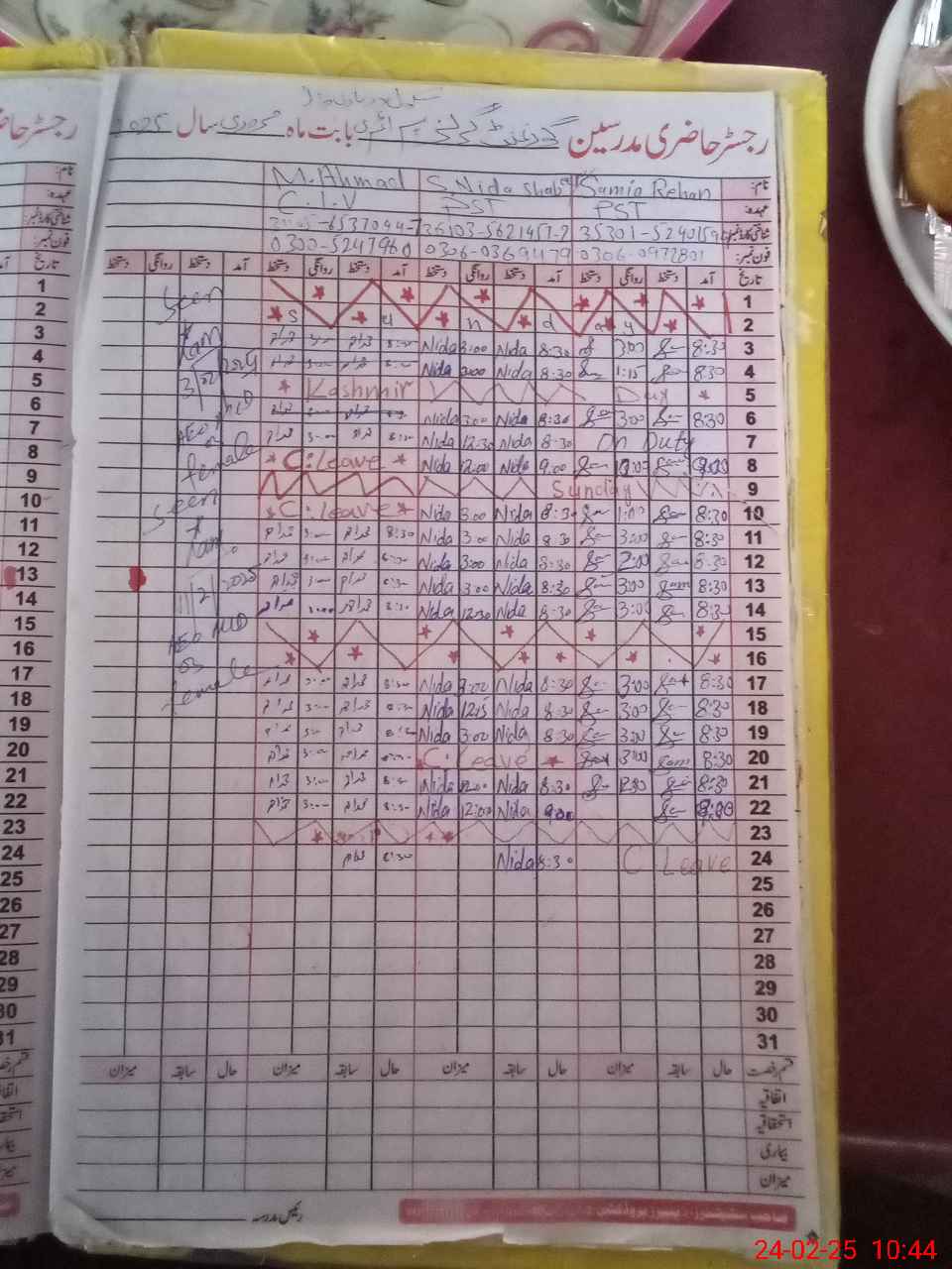 | CNIC | Full Name | Designation | R/C | Absence During Last Calender Month |