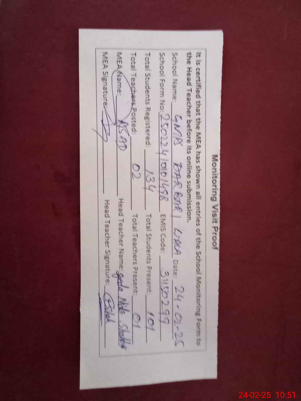 | Attendance Register | Head Teacher | MEA with School | Visit Proof |