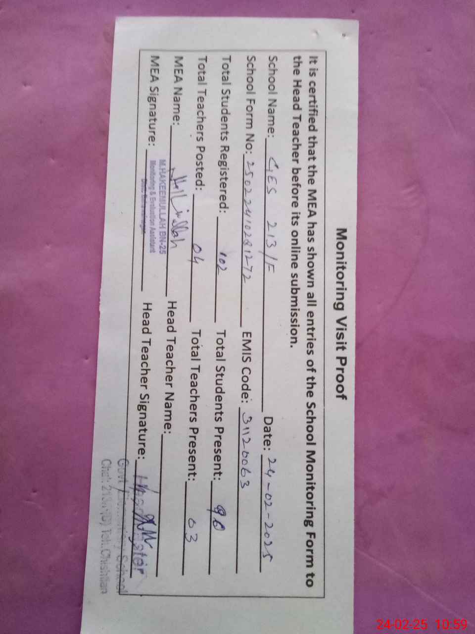 | Attendance Register | Head Teacher | MEA with School | Visit Proof |