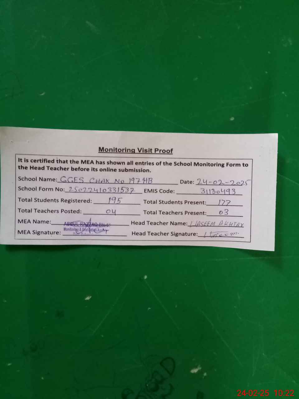| EMIS Code: 31130493 | Name of School: GGES CHAK NO. 197/HB | |||