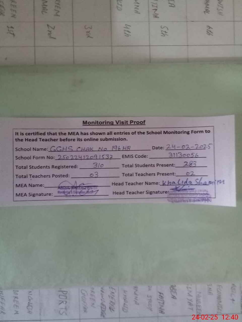 | EMIS Code: 31130056 | Name of School: GGHS CHAK NO 196 HB | |||