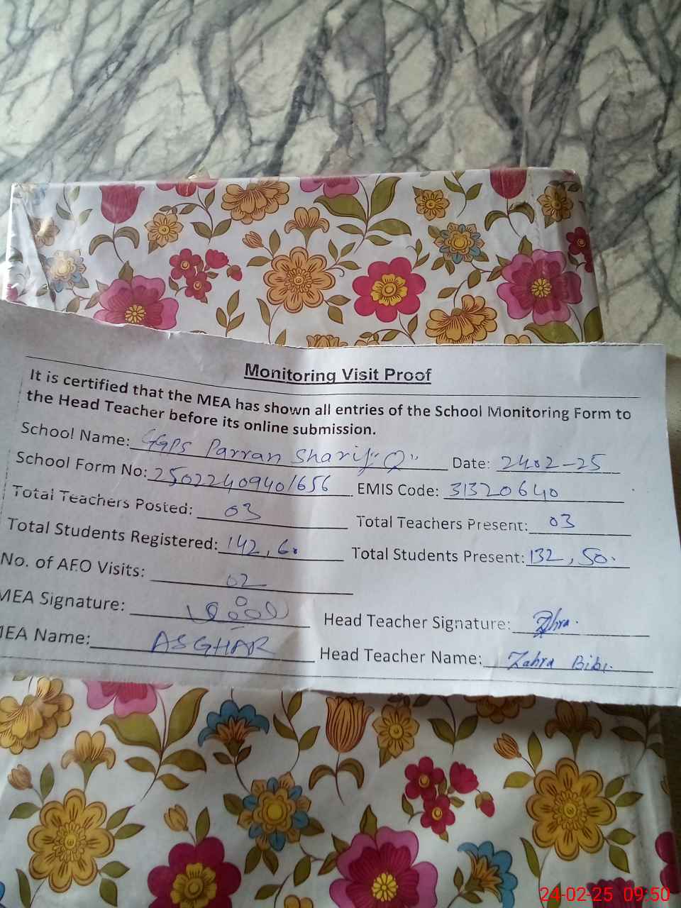 | Attendance Register | Head Teacher | MEA with School | Visit Proof |