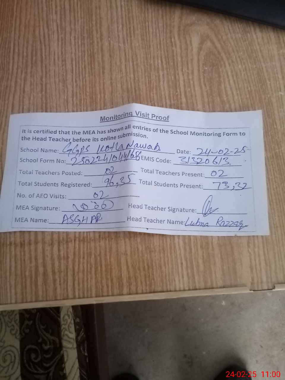 | Attendance Register | Head Teacher | MEA with School | Visit Proof |