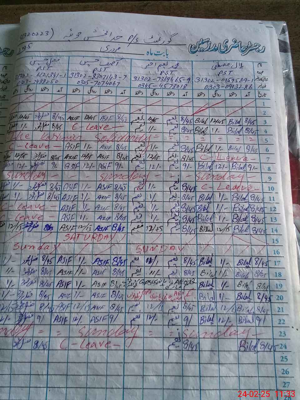 | CNIC | Full Name | Designation | R/C | Absence During Last Calender Month |