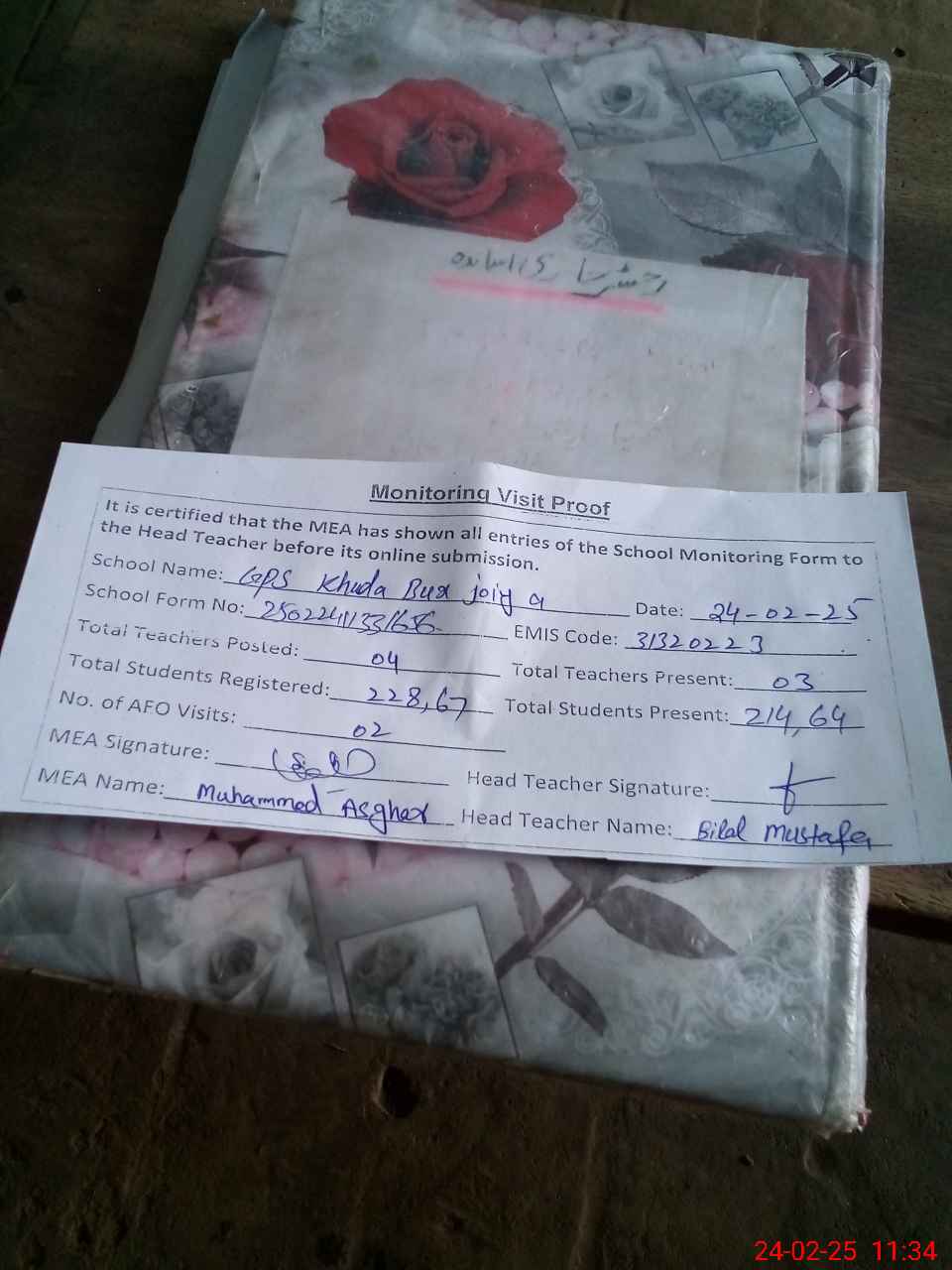 | Attendance Register | Head Teacher | MEA with School | Visit Proof |